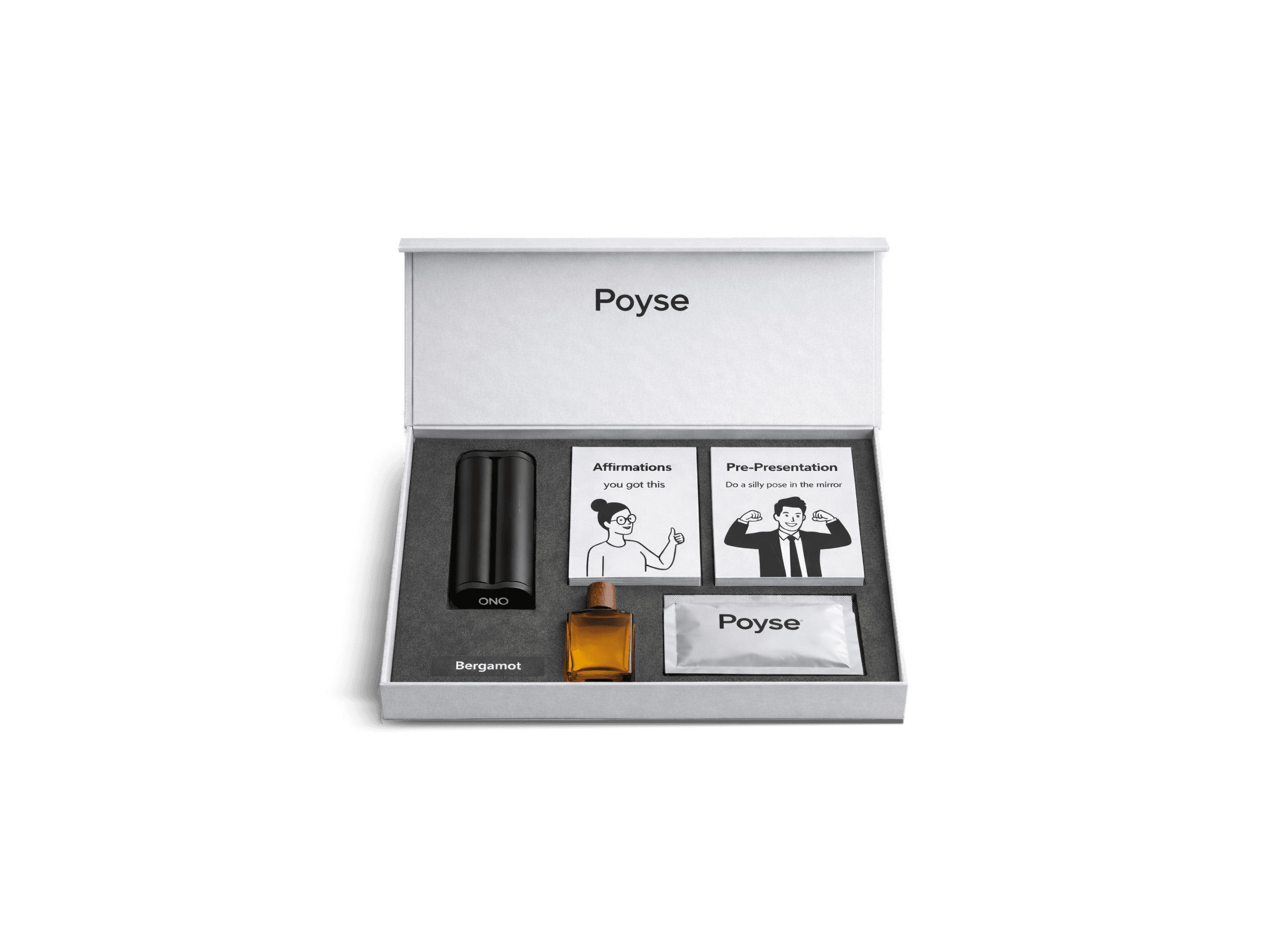 When anxiety peaks, physical tools work faster than logic. POYSE’s toolkit is designed to be used minutes before speaking — discreetly, professionally, anywhere.